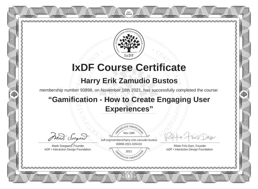 Harry Erik Zamudio Bustos's IxDF Course Certificate: Gamification - How to Create Engaging User Experiences
