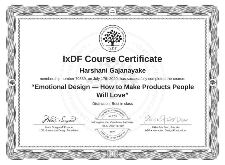 Harshani Gajanayake's IxDF Course Certificate: Emotional Design — How to Make Products People Will Love
