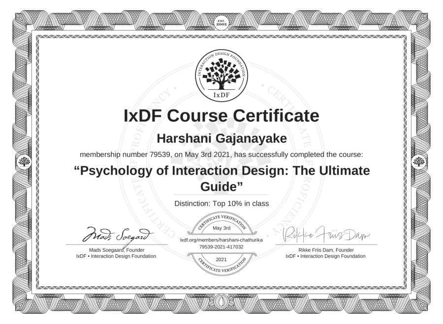 Harshani Gajanayake's IxDF Course Certificate: Psychology of Interaction Design: The Ultimate Guide