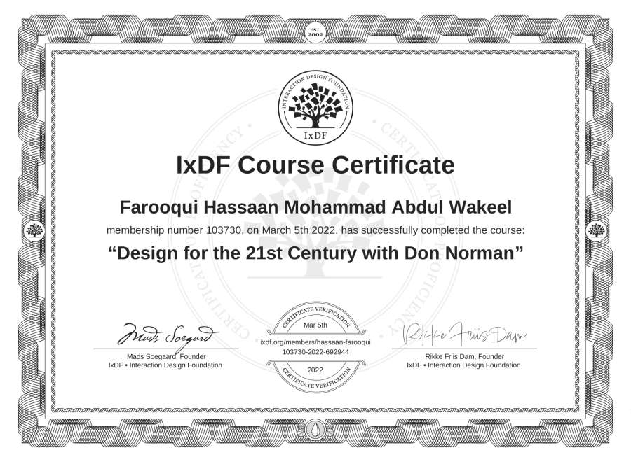 Farooqui Hassaan Mohammad Abdul Wakeel's IxDF Course Certificate: Design for the 21st Century with Don Norman