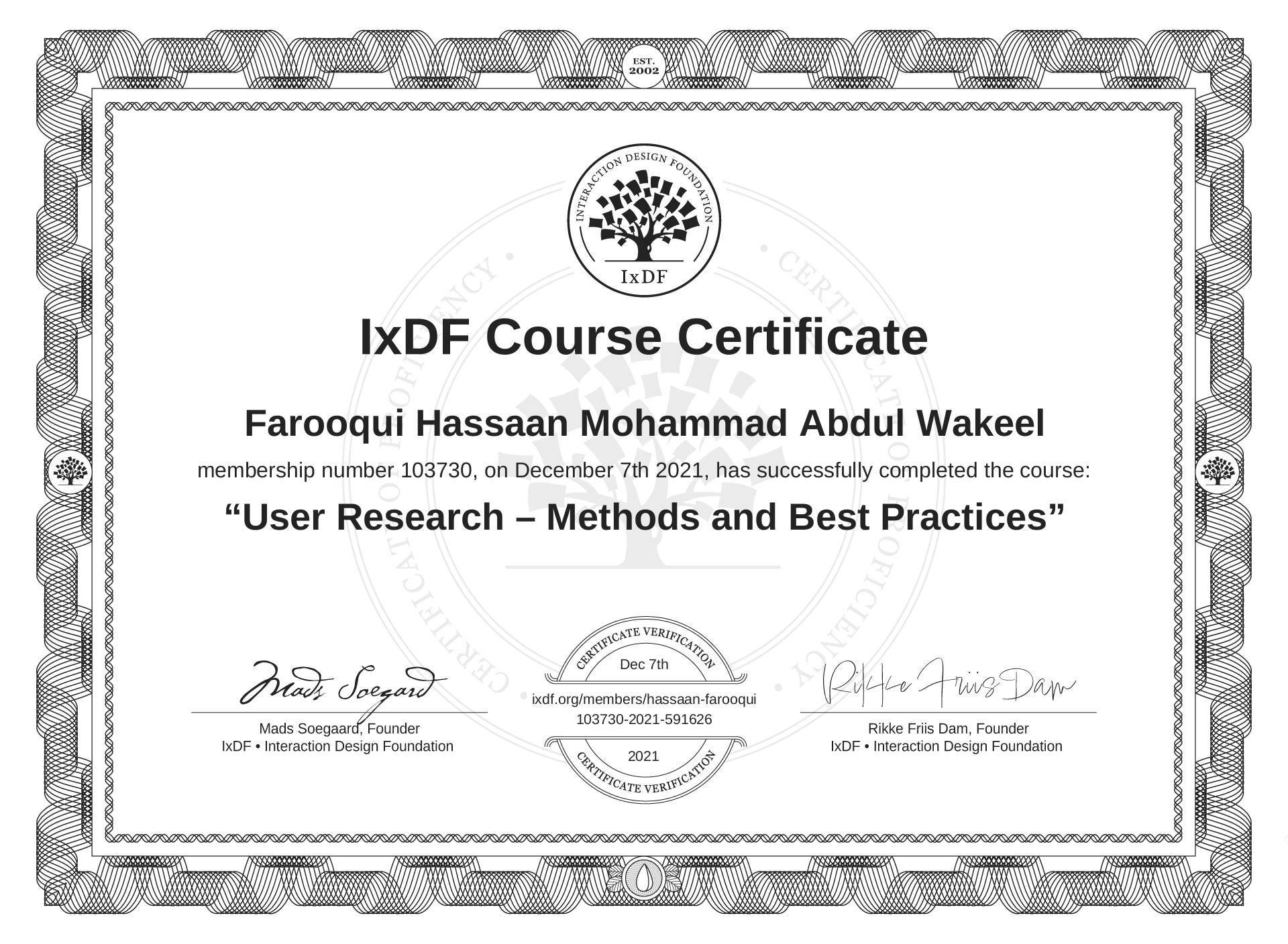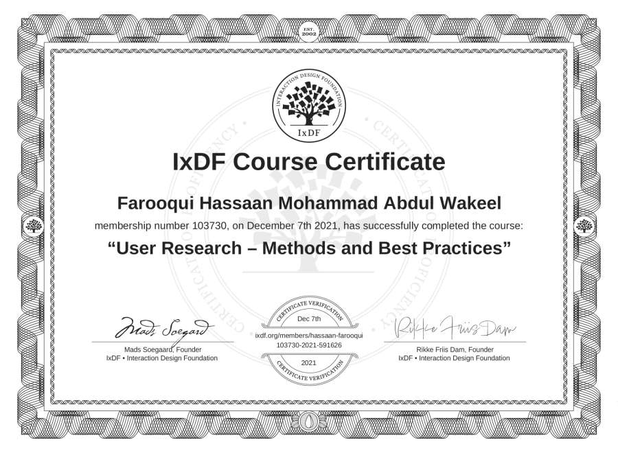 Farooqui Hassaan Mohammad Abdul Wakeel's IxDF Course Certificate: User Research – Methods and Best Practices