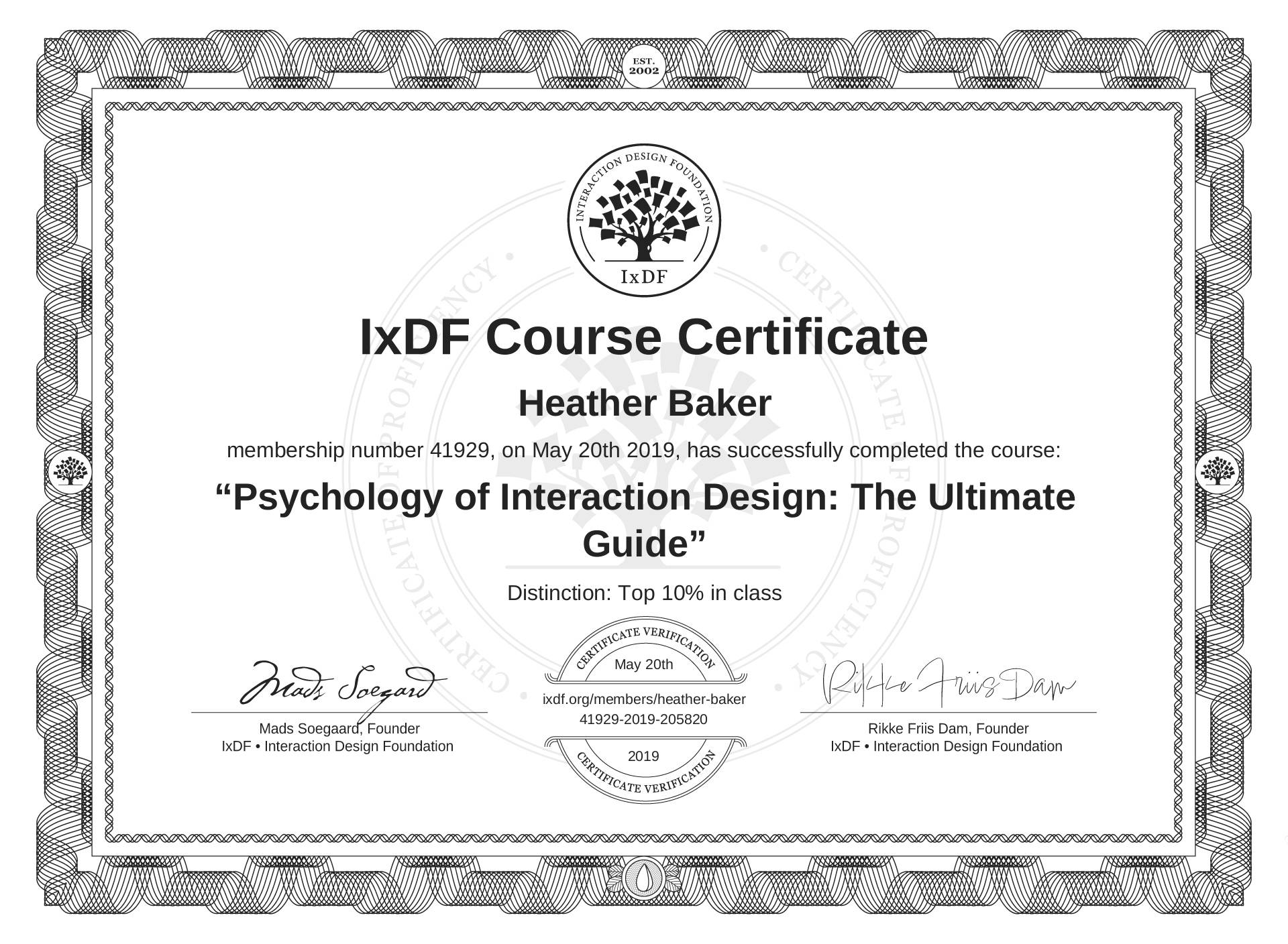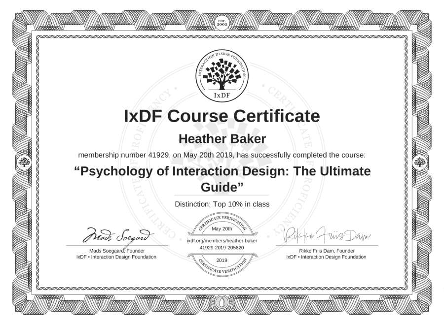 Heather Baker's IxDF Course Certificate: Psychology of Interaction Design: The Ultimate Guide