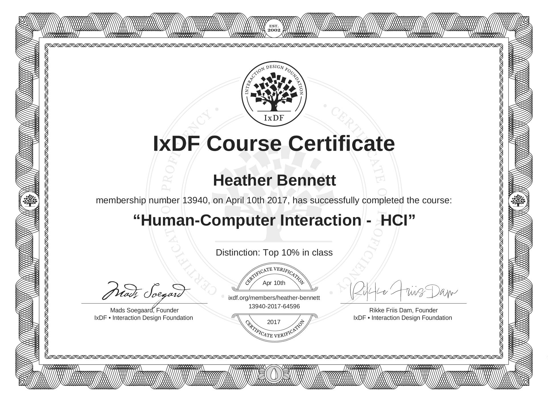 The IxDF Course Certificate above is awarded to Heather Bennett with a Top 10% Distinction in formal recognition of their coursework surpassing the rigorous benchmarks of exceptional performance established by the IxDF Educational Codex.