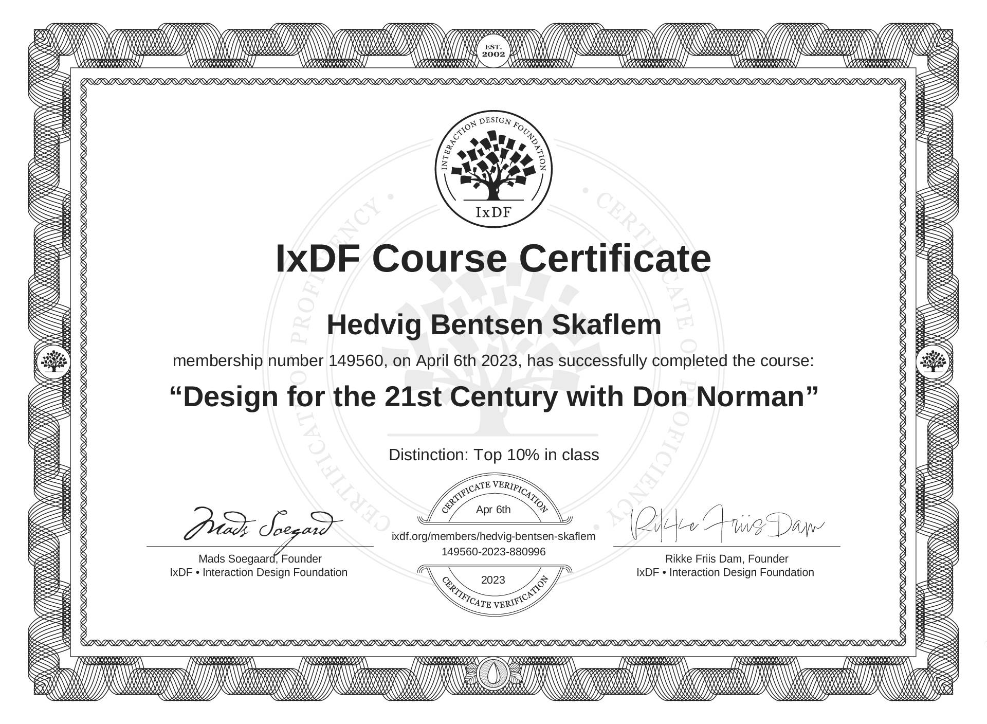 The IxDF Course Certificate above is awarded to Hedvig Bentsen Skaflem with a Top 10% Distinction in formal recognition of their coursework surpassing the rigorous benchmarks of exceptional performance established by the IxDF Educational Codex.