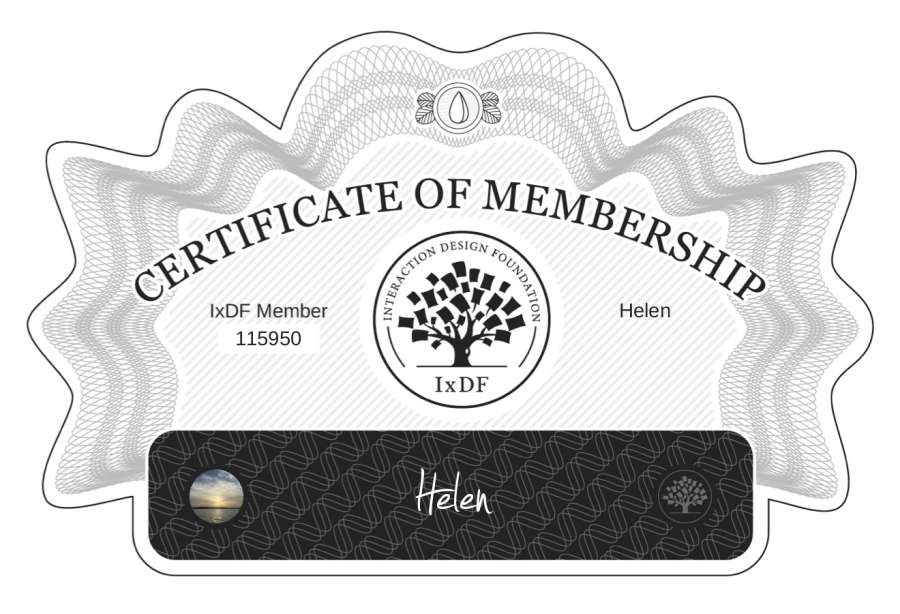 The Membership Certificate below verifies that Helen is a member of Interaction Design Foundation.