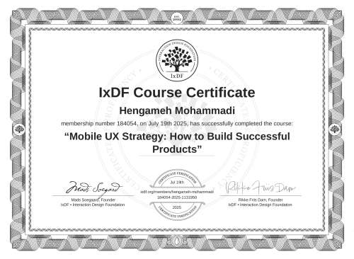 IxDF Course Certificates are awarded to Hengameh Mohammadi in formal recognition of their coursework surpassing the rigorous benchmarks of exceptional performance established by the IxDF Educational Codex.