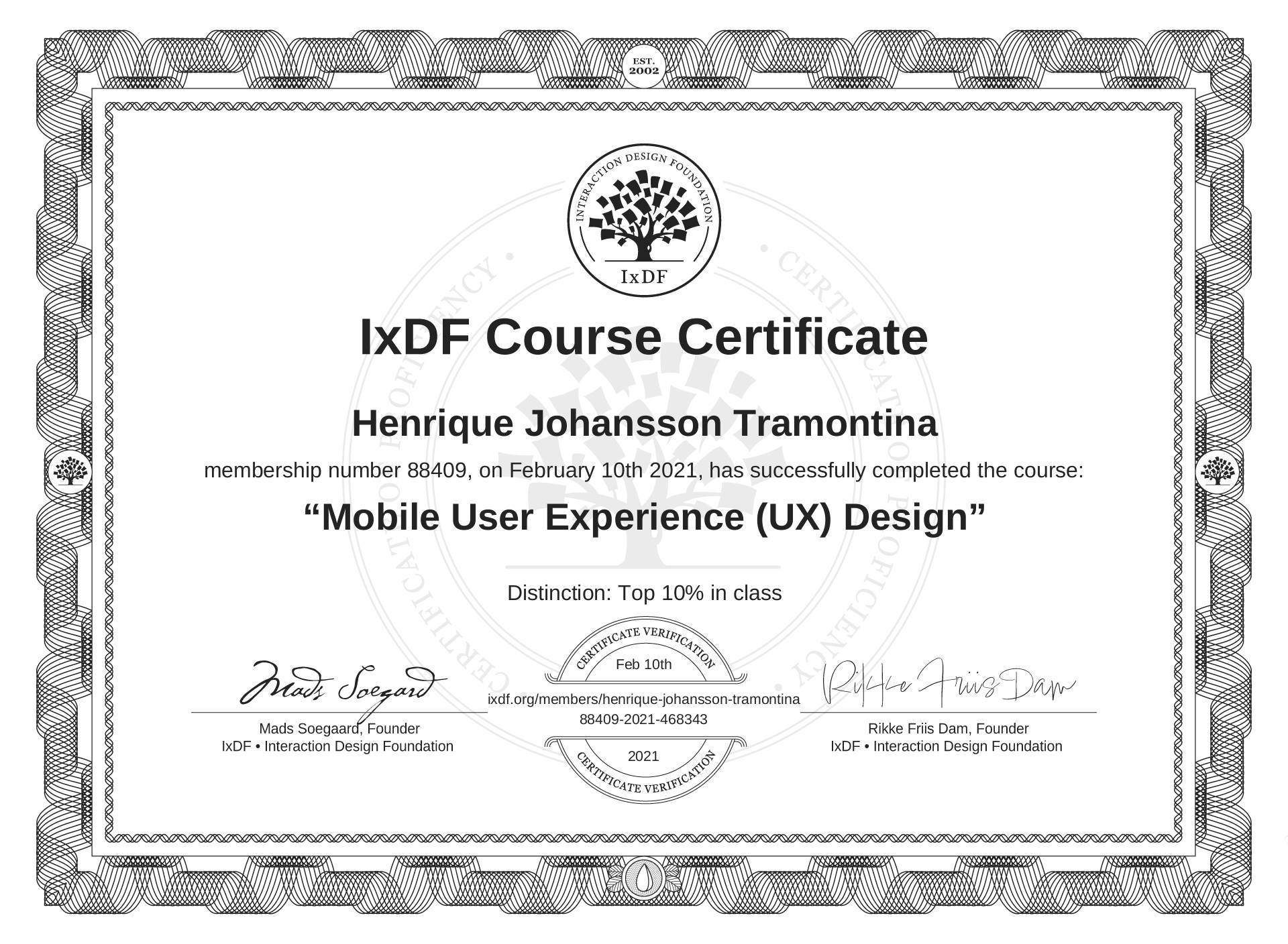 Henrique Johansson Tramontina's IxDF Course Certificate: Mobile User Experience (UX) Design