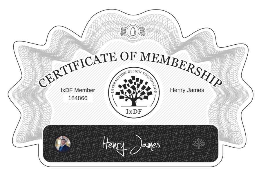The Membership Certificate below verifies that Henry James is a member of Interaction Design Foundation.