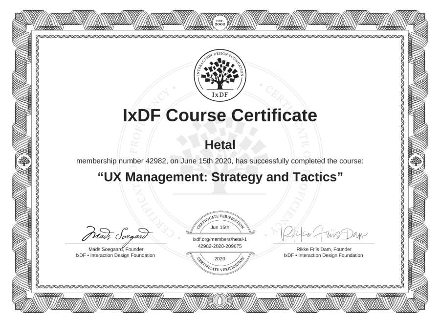 Hetal's IxDF Course Certificate: UX Management: Strategy and Tactics
