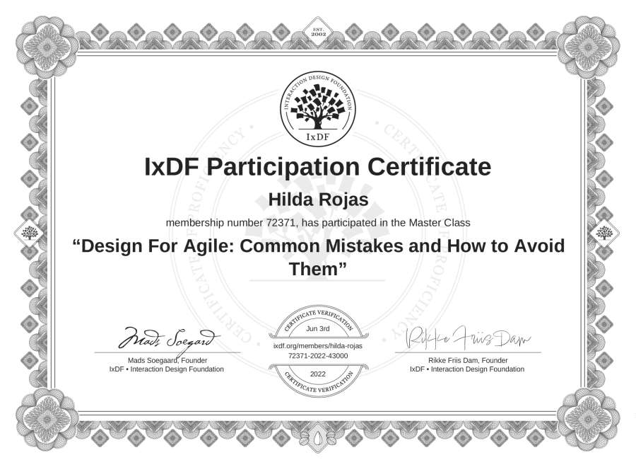 Hilda Rojas's IxDF Masterclass Certificate: Design For Agile: Common Mistakes and How to Avoid Them