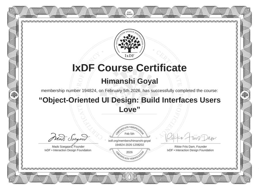 Himanshi Goyal's IxDF Course Certificate: Object-Oriented UI Design: Build Interfaces Users Love
