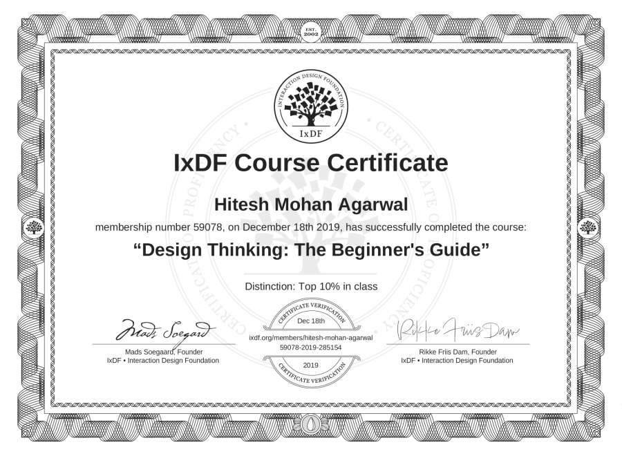 The IxDF Course Certificate above is awarded to Hitesh Mohan Agarwal with a Top 10% Distinction in formal recognition of their coursework surpassing the rigorous benchmarks of exceptional performance established by the IxDF Educational Codex.