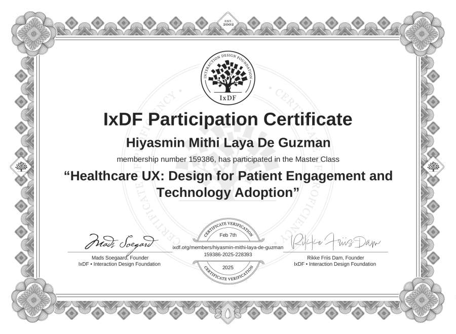 Hiyasmin Mithi Laya De Guzman's IxDF Masterclass Certificate: Healthcare UX: Design for Patient Engagement and Technology Adoption