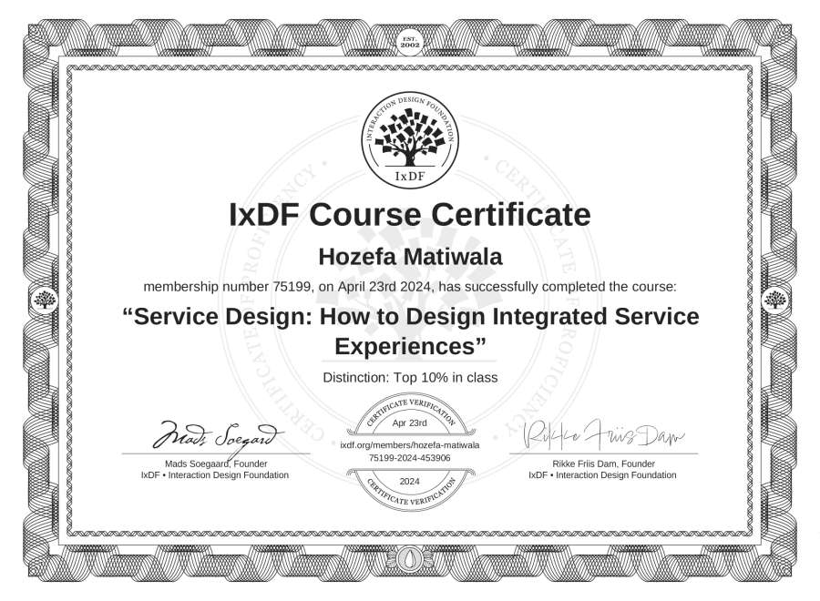 Hozefa Matiwala's IxDF Course Certificate: Service Design: How to Design Integrated Service Experiences