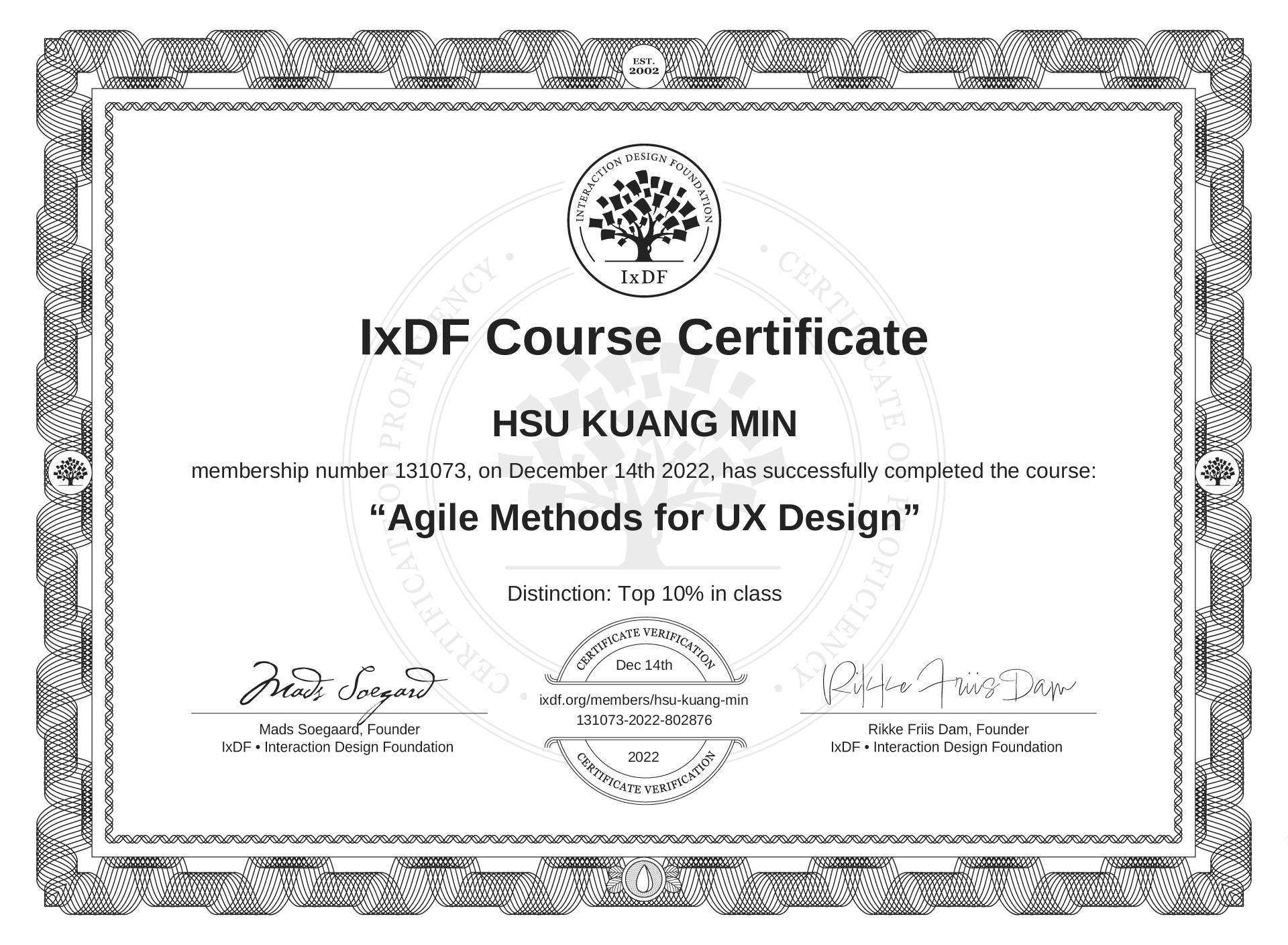 The IxDF Course Certificate above is awarded to HSU KUANG MIN with a Top 10% Distinction in formal recognition of their coursework surpassing the rigorous benchmarks of exceptional performance established by the IxDF Educational Codex.