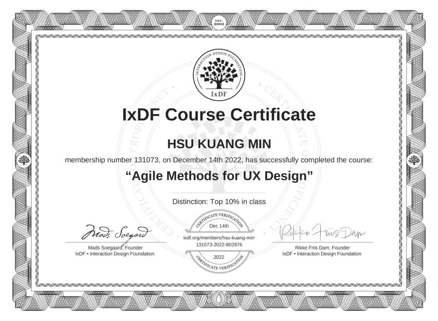 HSU KUANG MIN's IxDF Course Certificate: Agile Methods for UX Design