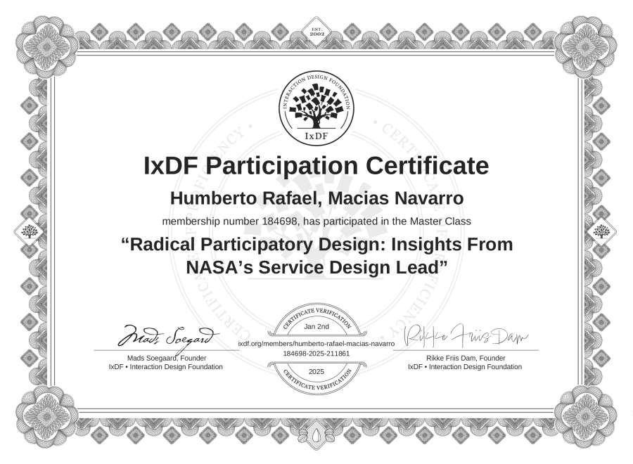 Humberto Rafael, Macías Navarro's IxDF Masterclass Certificate: Radical Participatory Design: Insights From NASA’s Service Design Lead