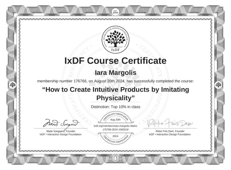 The IxDF Course Certificate above is awarded to Iara Margolis with a Top 10% Distinction in formal recognition of their coursework surpassing the rigorous benchmarks of exceptional performance established by the IxDF Educational Codex.