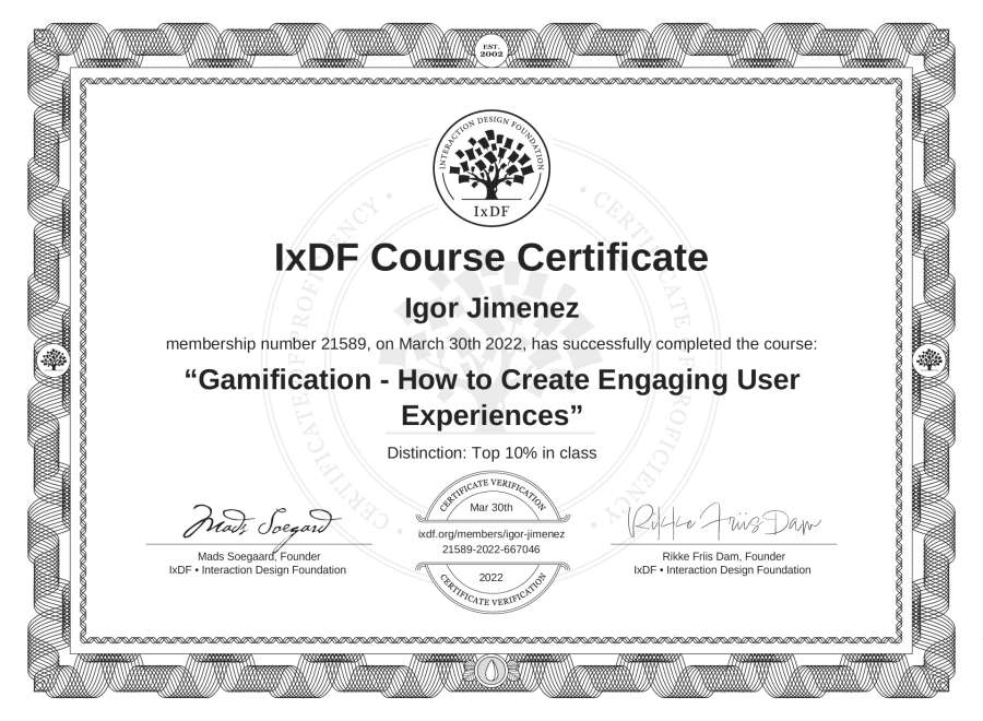 Igor Jimenez's IxDF Course Certificate: Gamification - How to Create Engaging User Experiences