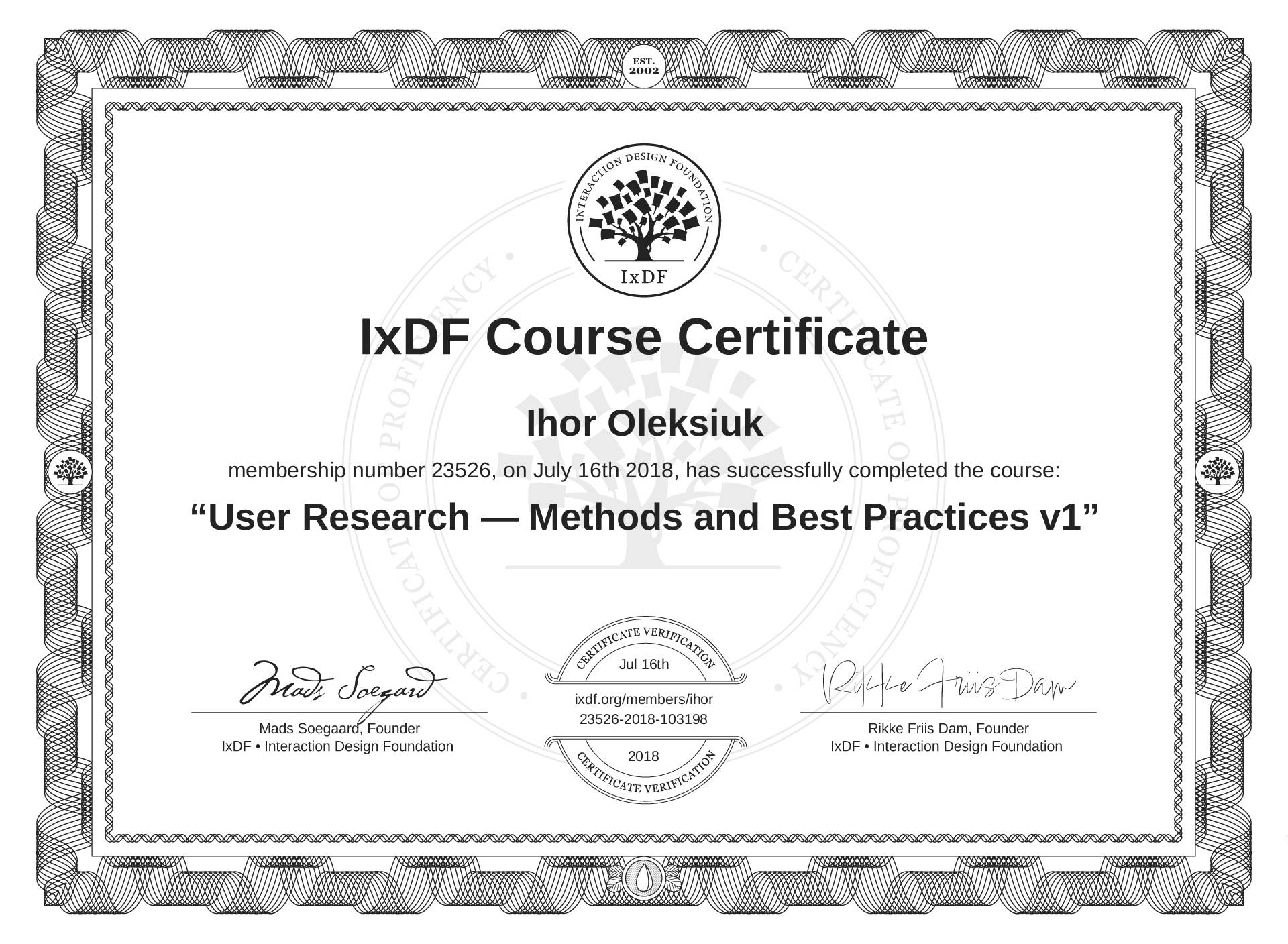 Ihor Oleksiuk's IxDF Course Certificate: User Research — Methods and Best Practices v1