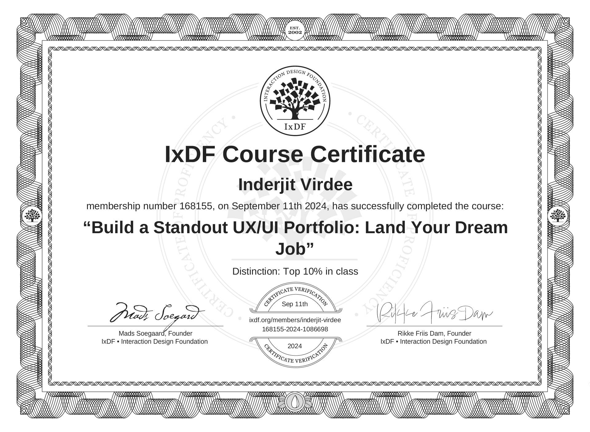 Inderjit Virdee's IxDF Course Certificate: Build a Standout UX/UI Portfolio: Land Your Dream Job