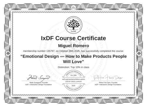 IxDF Course Certificates are awarded to Miguel Romero in formal recognition of their coursework surpassing the rigorous benchmarks of exceptional performance established by the IxDF Educational Codex.