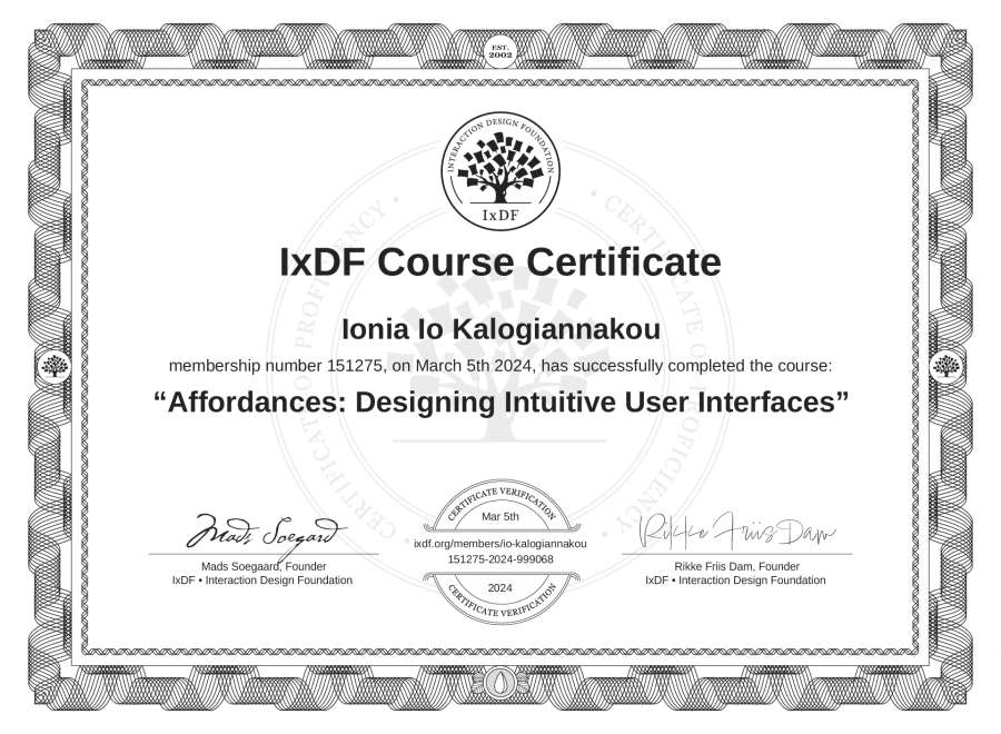 Ionia Io Kalogiannakou's IxDF Course Certificate: Affordances: Designing Intuitive User Interfaces