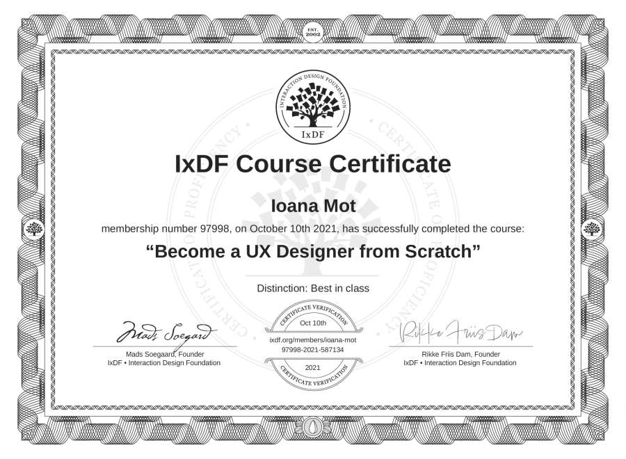 The IxDF Course Certificate above is awarded to Ioana Mot with a Best in Class Distinction in formal recognition of their coursework surpassing the rigorous benchmarks of exceptional performance established by the IxDF Educational Codex.