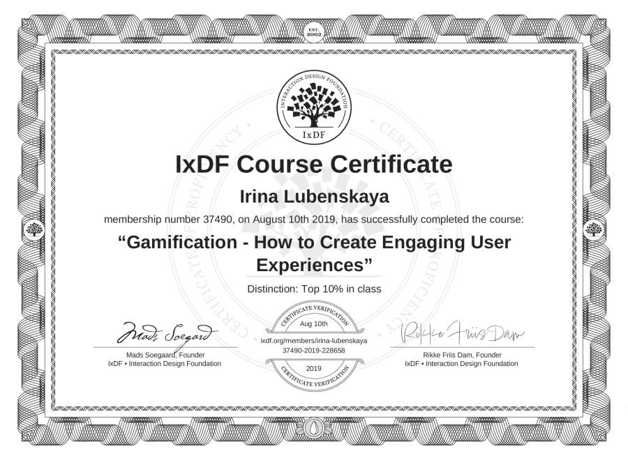 Irina Lubenskaya's IxDF Course Certificate: Gamification - How to Create Engaging User Experiences