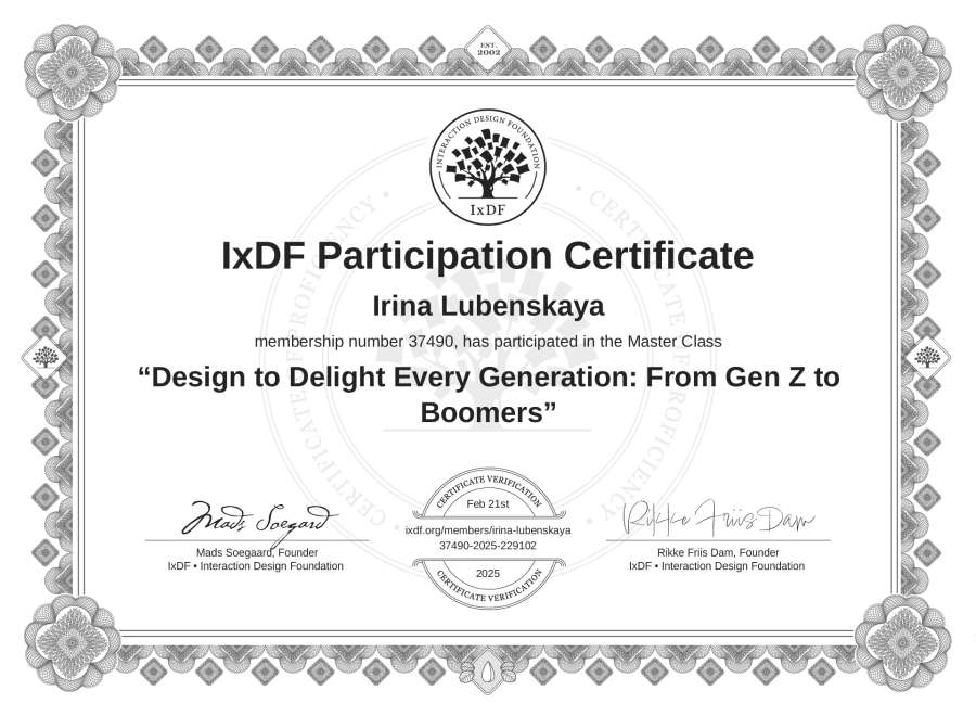 Irina Lubenskaya's IxDF Masterclass Certificate: Design to Delight Every Generation: From Gen Z to Boomers