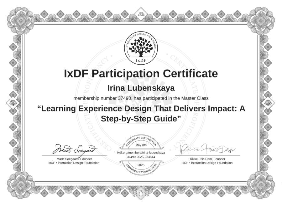 Irina Lubenskaya's IxDF Masterclass Certificate: Learning Experience Design That Delivers Impact: A Step-by-Step Guide