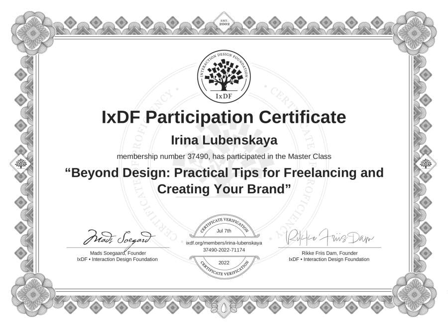 Irina Lubenskaya's IxDF Masterclass Certificate: Beyond Design: Practical Tips for Freelancing and Creating Your Brand