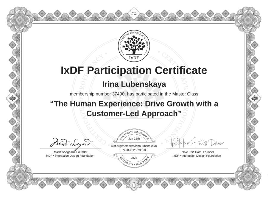 Irina Lubenskaya's IxDF Masterclass Certificate: The Human Experience: Drive Growth with a Customer-Led Approach