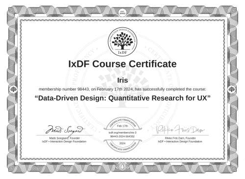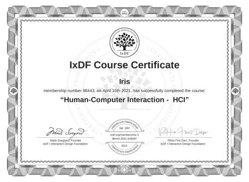 IxDF Course Certificates are awarded to Iris in formal recognition of their coursework surpassing the rigorous benchmarks of exceptional performance established by the IxDF Educational Codex.
