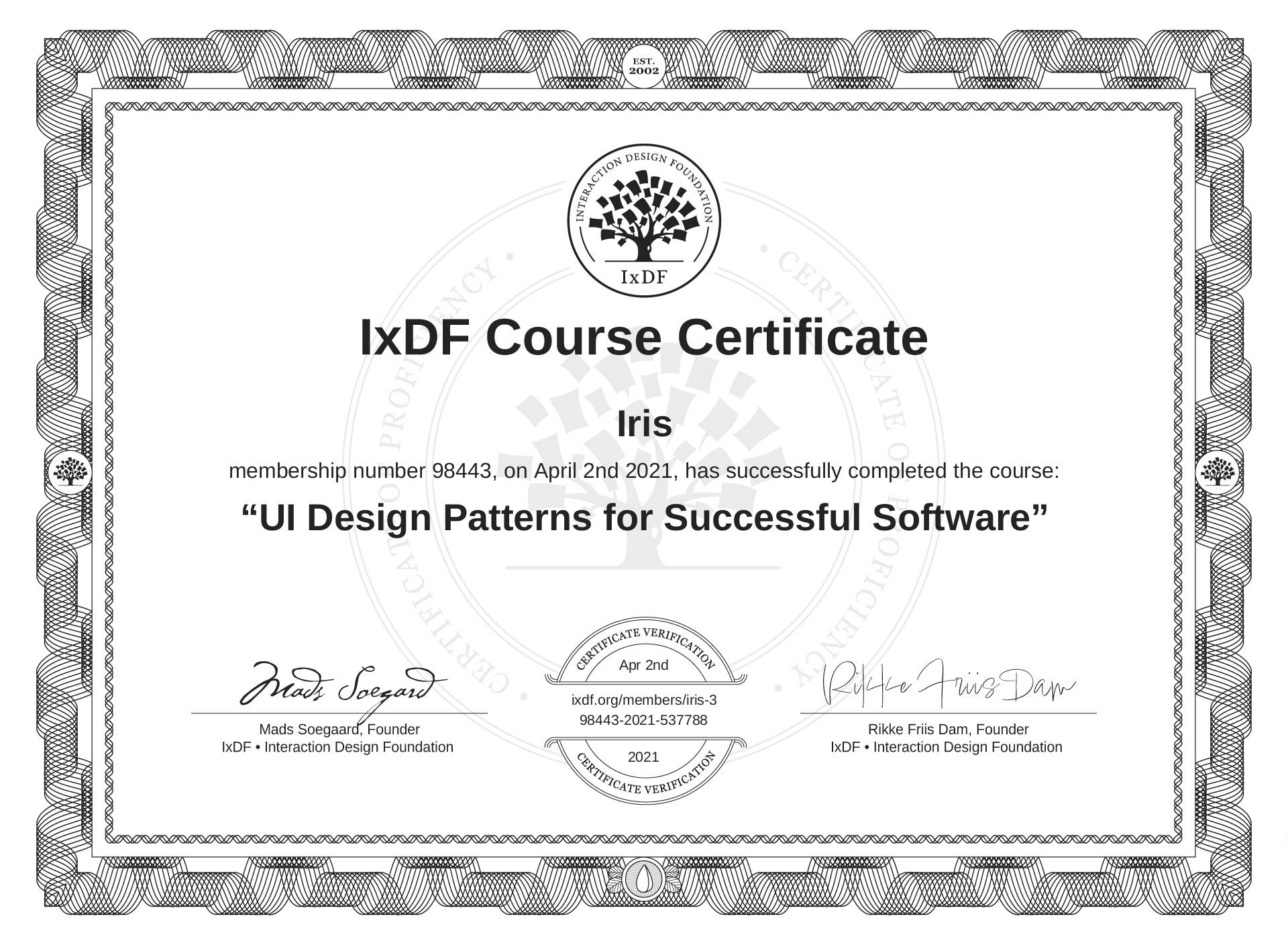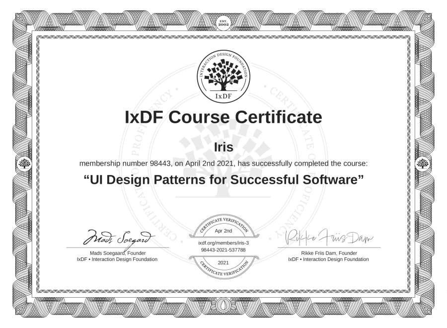 Iris's IxDF Course Certificate: UI Design Patterns for Successful Software