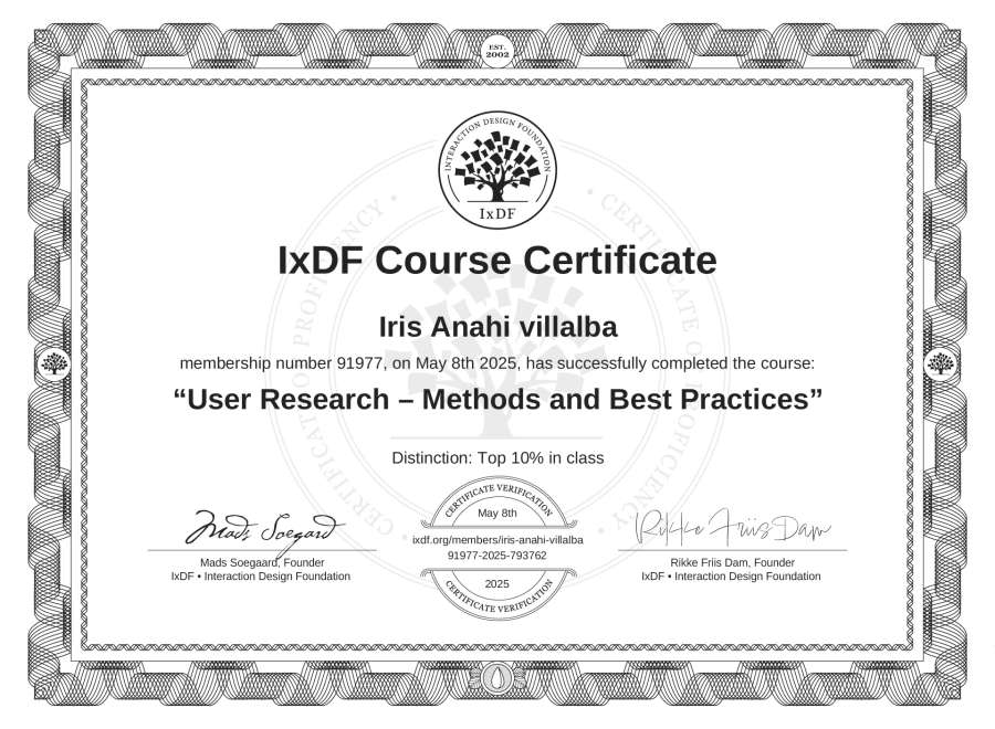 The IxDF Course Certificate above is awarded to Iris Anahi villalba with a Top 10% Distinction in formal recognition of their coursework surpassing the rigorous benchmarks of exceptional performance established by the IxDF Educational Codex.