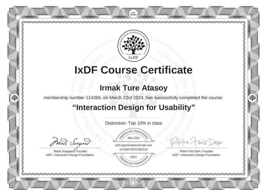 Irmak Türe Atasoy's IxDF Course Certificate: Interaction Design for Usability