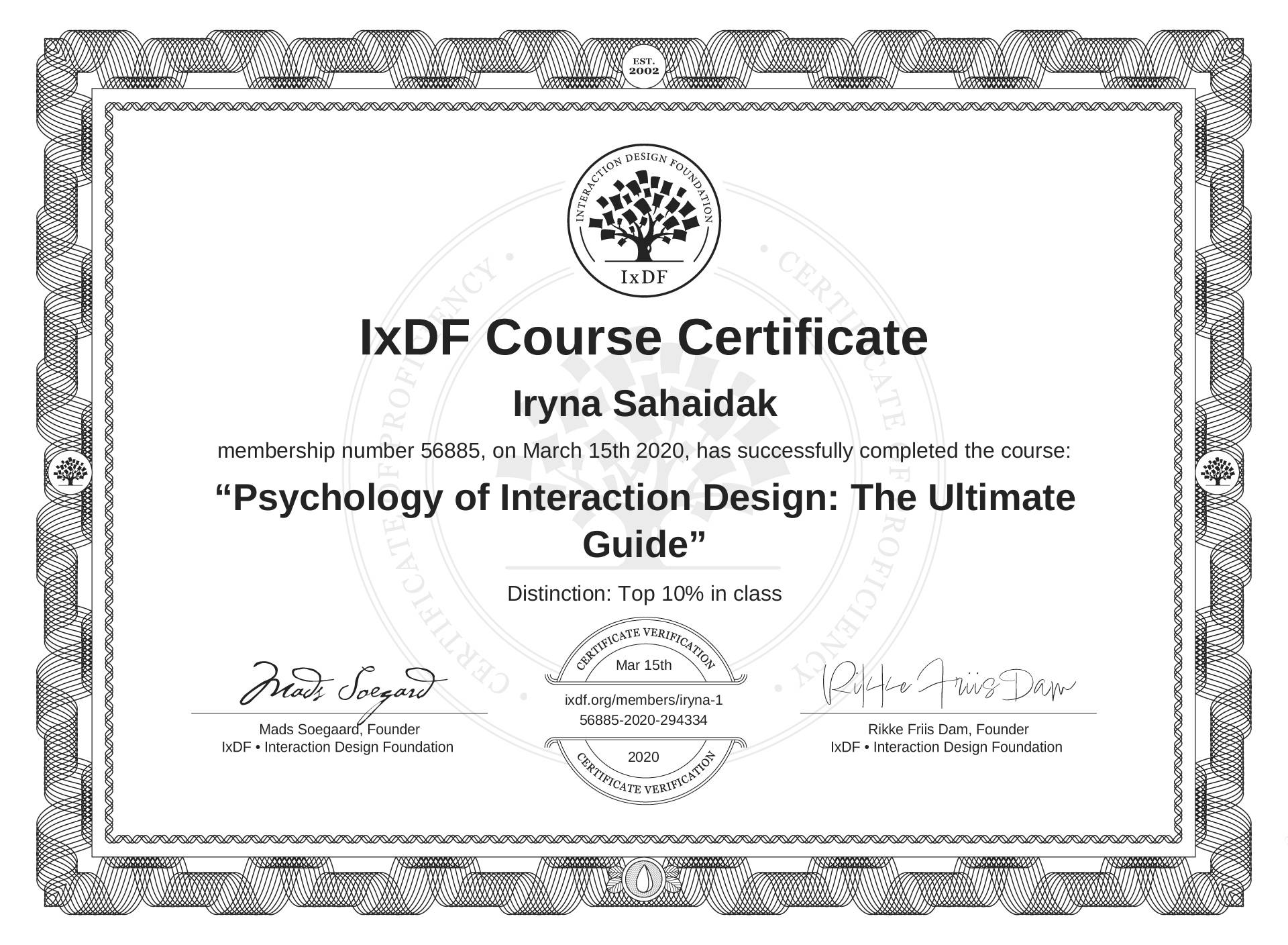 Iryna Sahaidak's IxDF Course Certificate: Psychology of Interaction Design: The Ultimate Guide