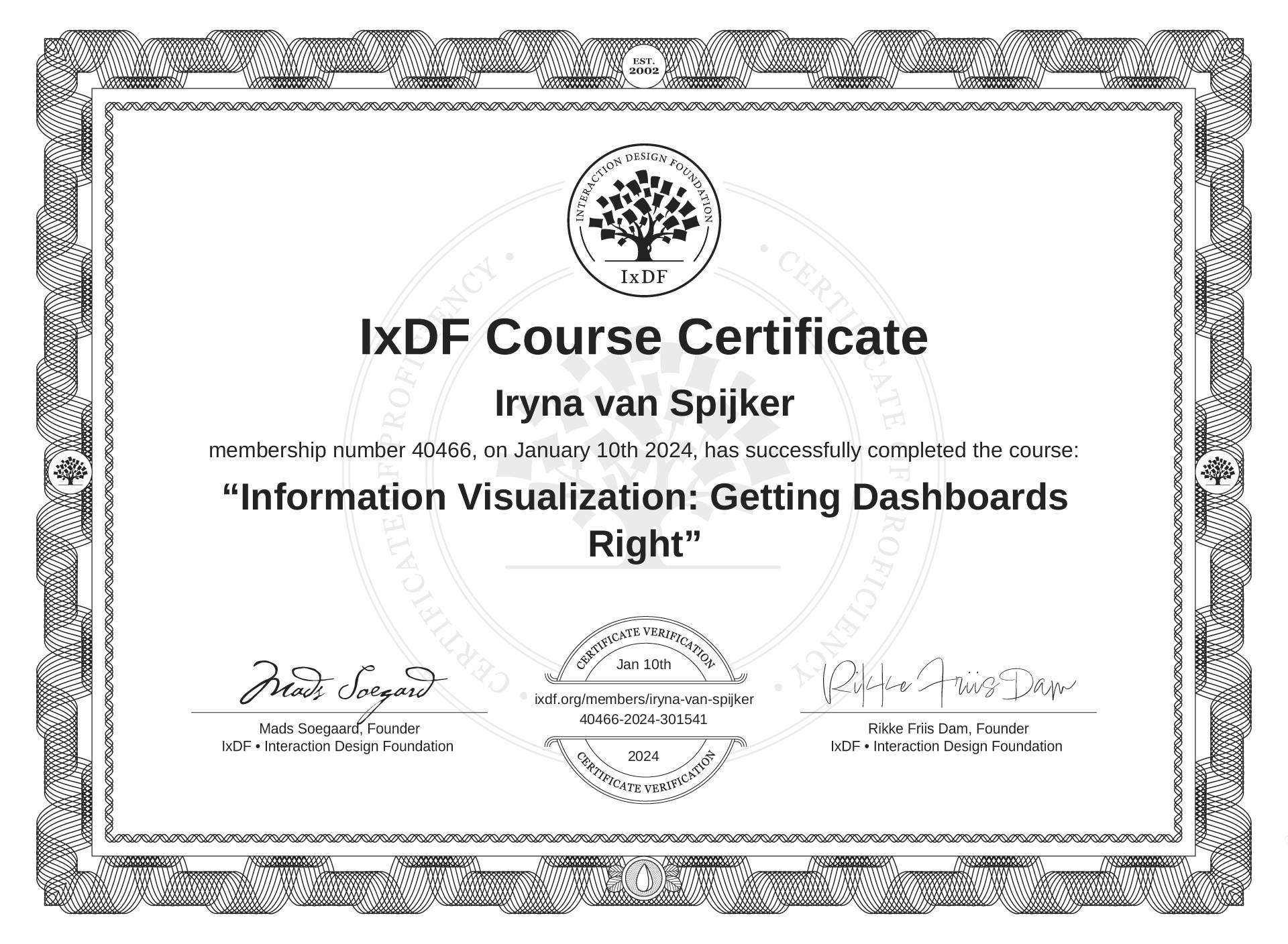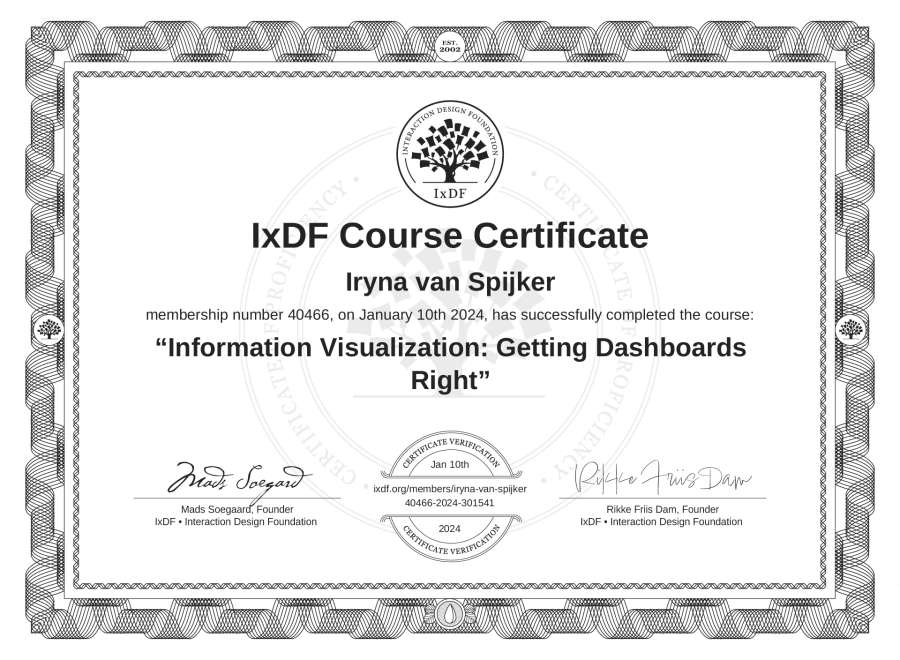 Iryna van Spijker's IxDF Course Certificate: Information Visualization: Getting Dashboards Right