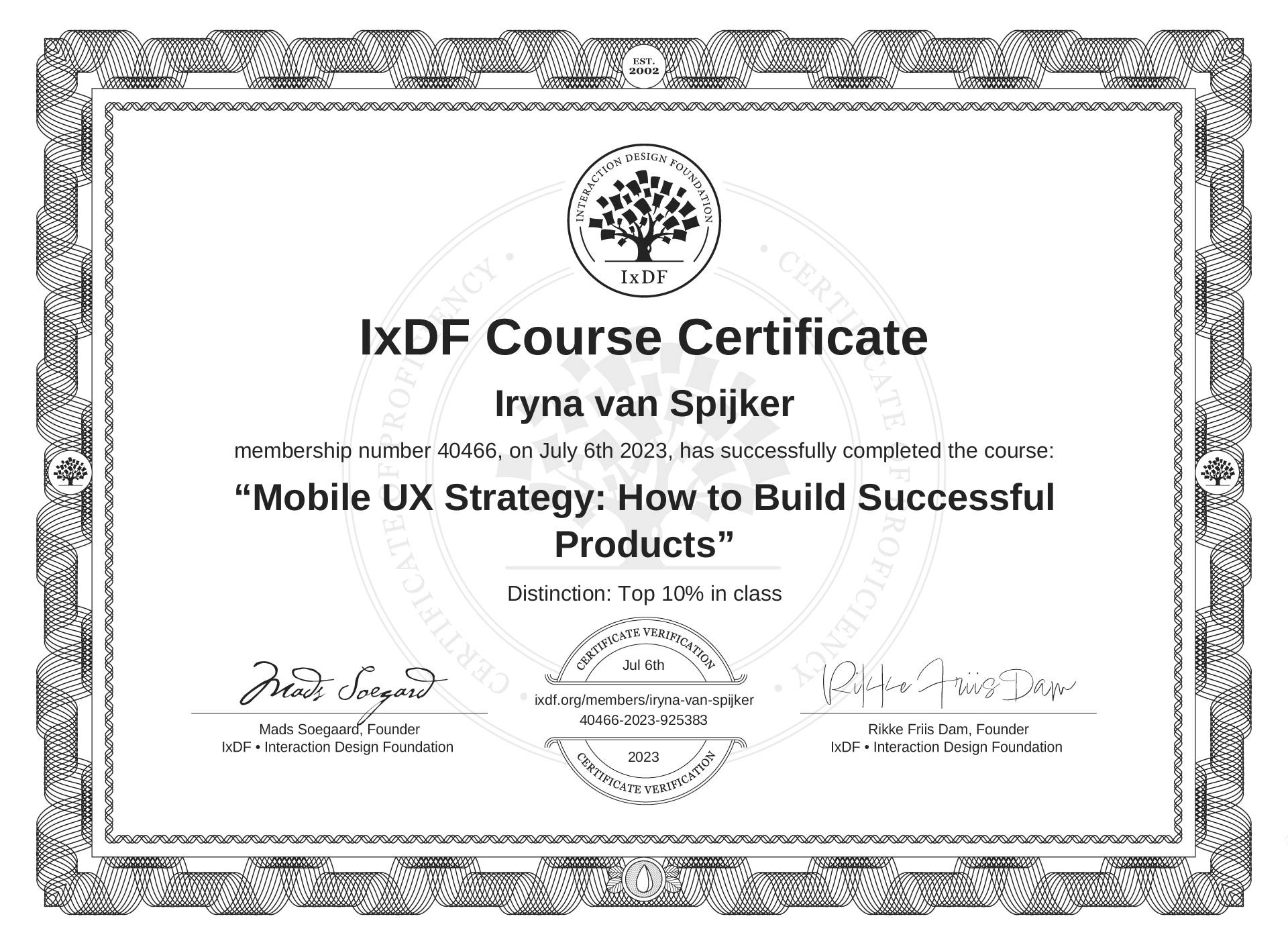 Iryna van Spijker's IxDF Course Certificate: Mobile UX Strategy: How to Build Successful Products