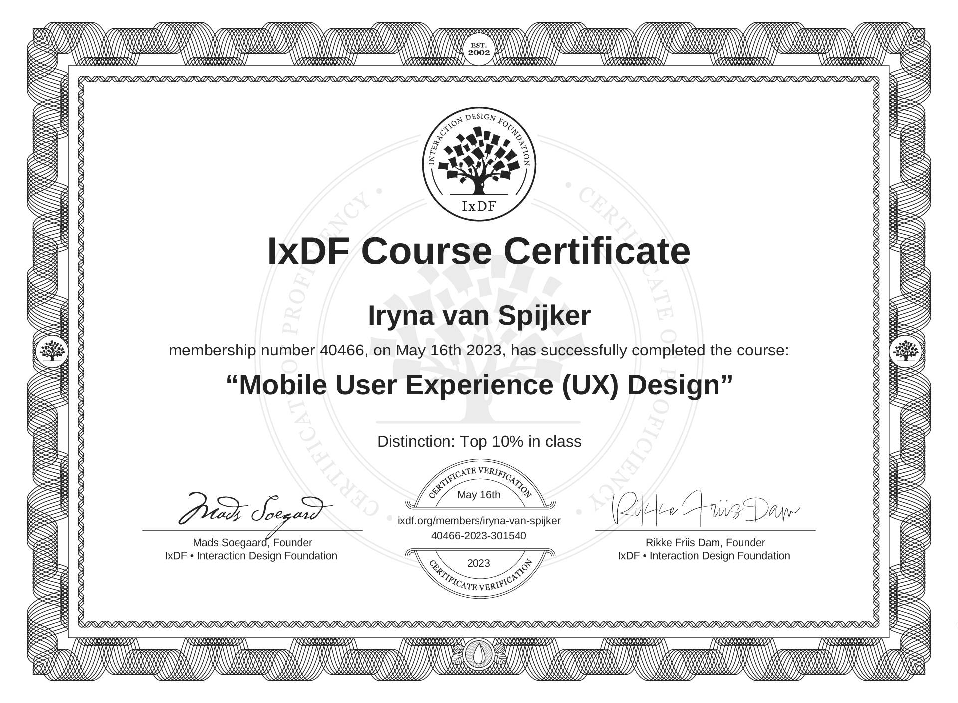 The IxDF Course Certificate above is awarded to Iryna van Spijker with a Top 10% Distinction in formal recognition of their coursework surpassing the rigorous benchmarks of exceptional performance established by the IxDF Educational Codex.