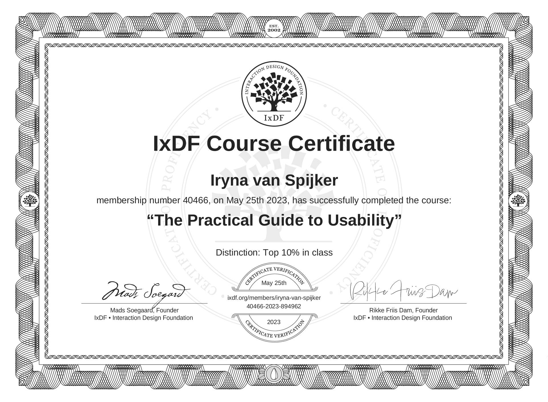 Iryna van Spijker's IxDF Course Certificate: The Practical Guide to Usability