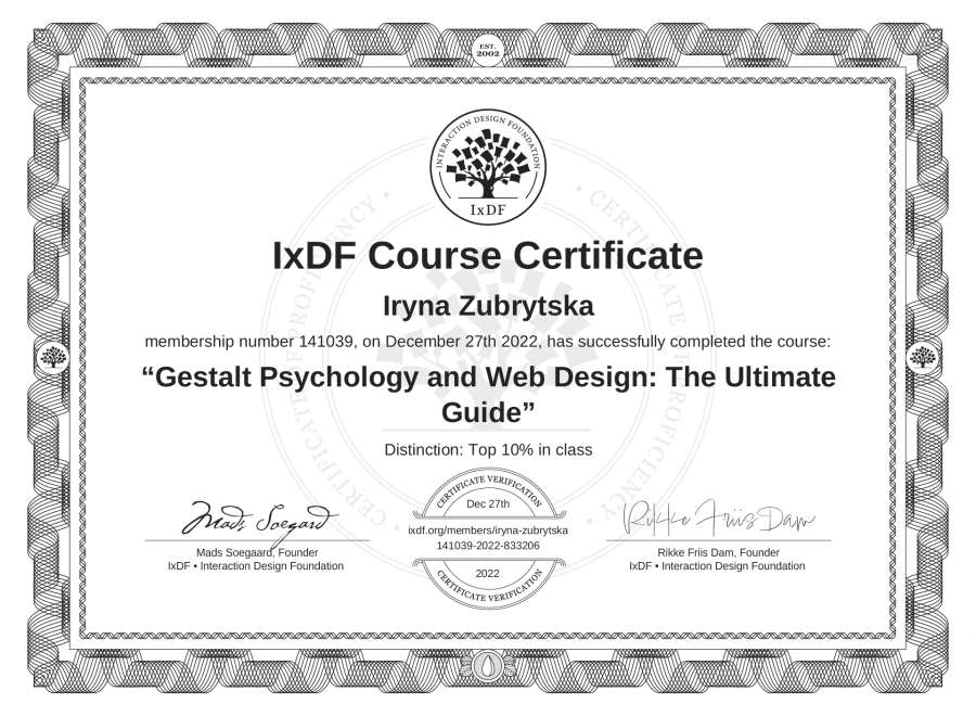 Iryna Zubrytska's IxDF Course Certificate: Gestalt Psychology and Web Design: The Ultimate Guide