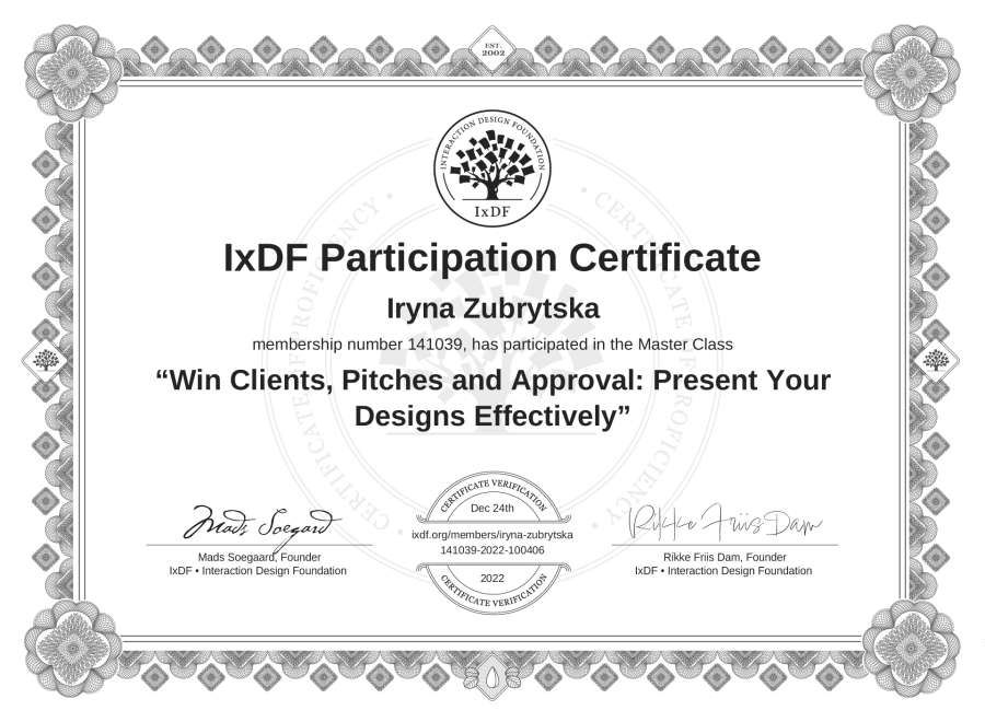 Iryna Zubrytska's IxDF Masterclass Certificate: Win Clients, Pitches and Approval: Present Your Designs Effectively