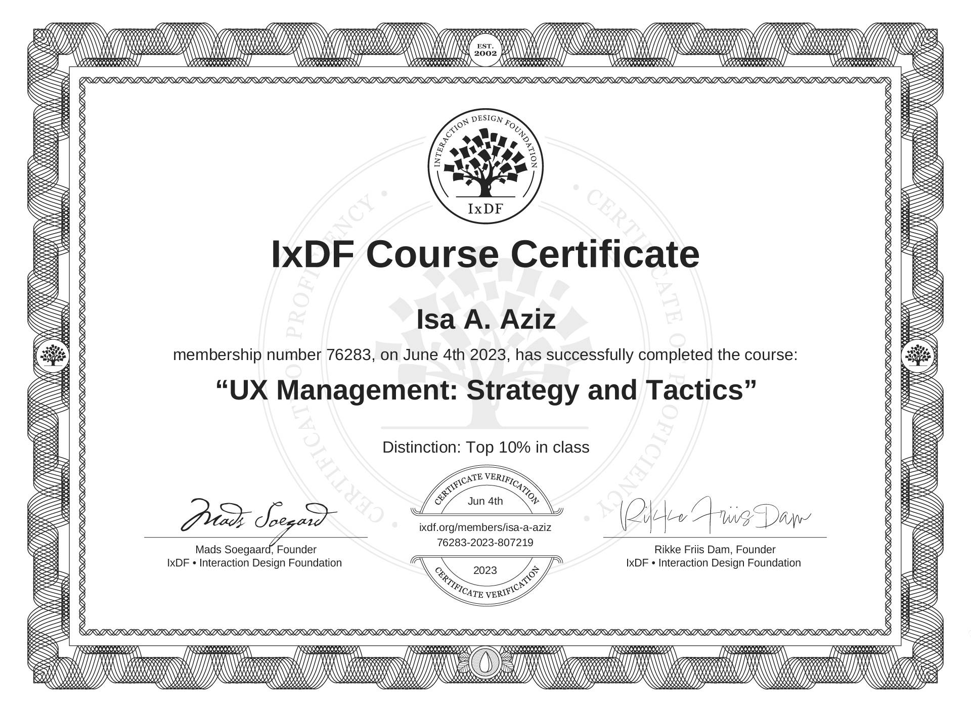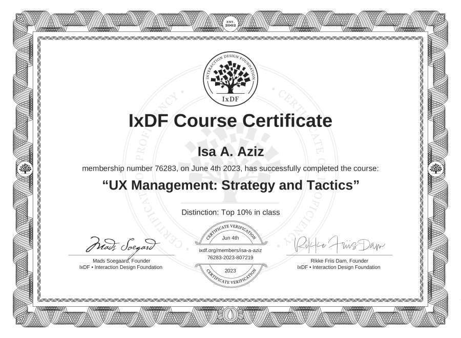 The IxDF Course Certificate above is awarded to Isa A. Aziz with a Top 10% Distinction in formal recognition of their coursework surpassing the rigorous benchmarks of exceptional performance established by the IxDF Educational Codex.