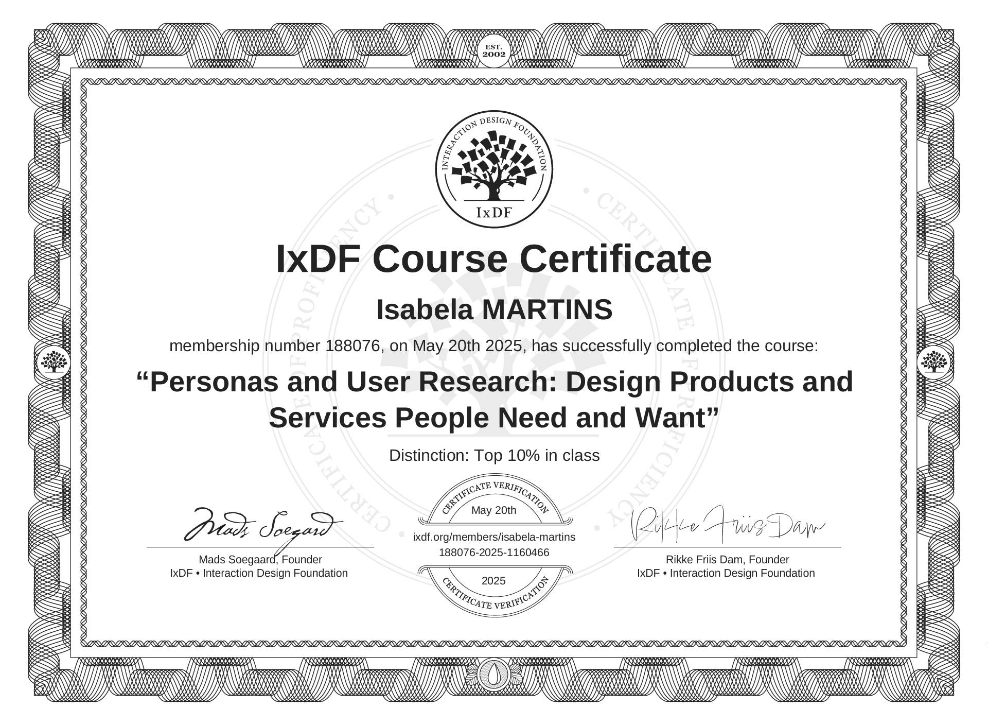 Isabela MARTINS's IxDF Course Certificate: Personas and User Research: Design Products and Services People Need and Want