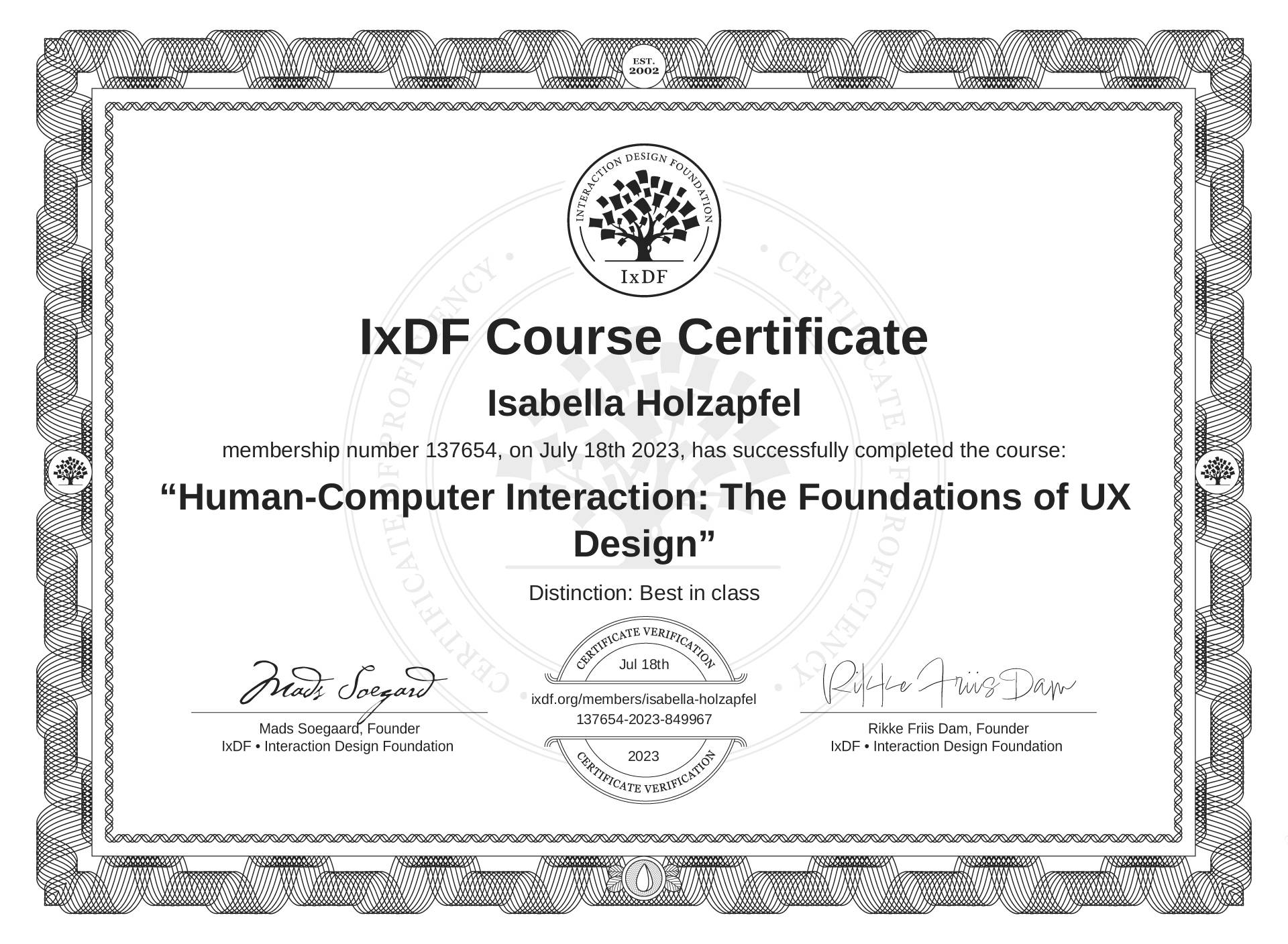 The IxDF Course Certificate above is awarded to Isabella Holzapfel with a Best in Class Distinction in formal recognition of their coursework surpassing the rigorous benchmarks of exceptional performance established by the IxDF Educational Codex.