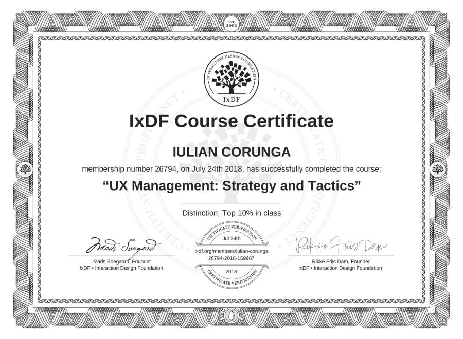 IULIAN CORUNGA's IxDF Course Certificate: UX Management: Strategy and Tactics