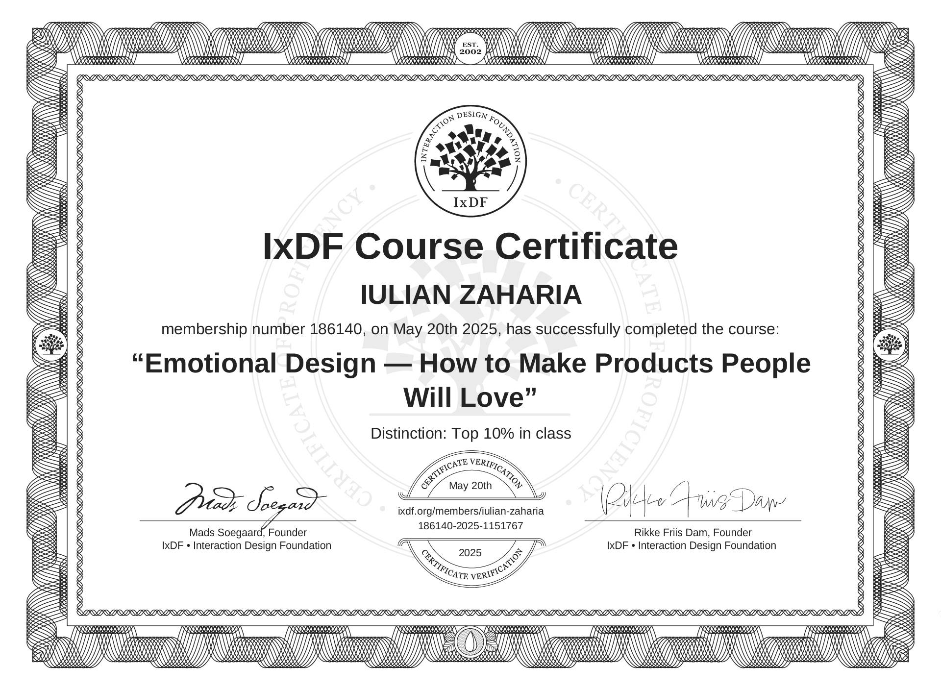 IULIAN ZAHARIA's IxDF Course Certificate: Emotional Design — How to Make Products People Will Love