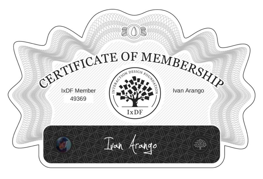The Membership Certificate below verifies that Ivan Arango is a member of Interaction Design Foundation.